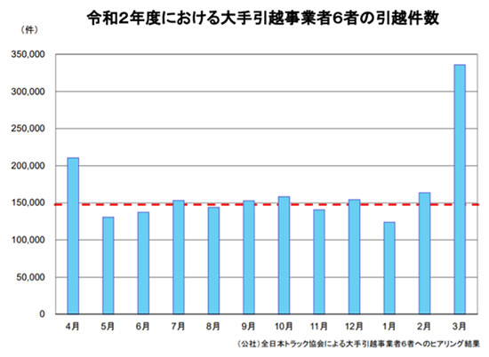 全日本トラック協会が2020年度の月別引越件数を大手引越事業者6者にヒアリングしたところ、通常月は15万件前後の引越件数に対し、3月は約34万件と2倍以上、4月も20万件超に達していることがわかりました。現在、新型コロナウイルスの感染拡大の影響もあって引越件数は例年を下回って推移しているものの、依然として依頼の集中は発生しているため、協力要請に及びました。