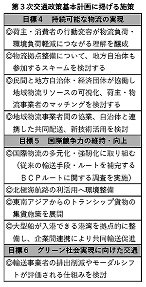 次期交通政策基本計画は11の目標を掲げており、このうち物流に深くかかわるのは3つあります。まず、「多様な政策のベストミックスによる持続可能な物流の実現」として、次期「総合物流施策大綱」に基づき、 物流の効率化、商慣行の見直し、荷主・消費者の行動変容等、多様な政策を組み合わせることで持続可能な物流を実現するとしました。地域の新産業創出にも資する物流拠点の整備、地方創生を支える物流機能の強化、ラストマイル配送の維持・確保について、いずれも地方自治体の関与を強調したものとなっています。